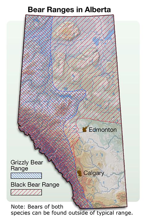 For the Province of Alberta, the following map illustrates territories of Grizzly Bears and Black Bears.